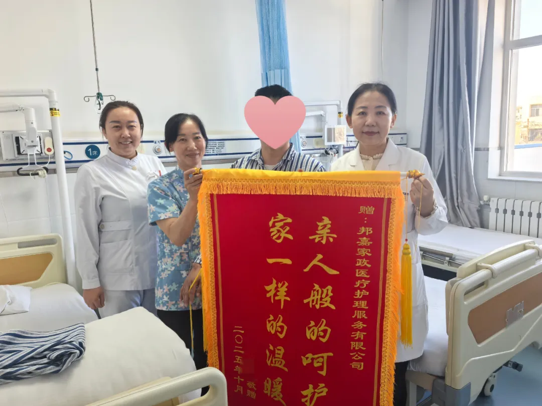 另一位患者出院后,家属特意送来一面锦旗以表达全家人的感谢。家属说,老人住院时,正赶上秋收农忙季节,得知医院有免陪照护服务,衡量比较之后就选择了,没想到服务这么好,这么方便。护理员们技术好,动作轻,还总是不厌其烦地陪着老人聊天,老人的病都好的快了。有专业的人照料,比他们儿女陪都要踏实、放心。