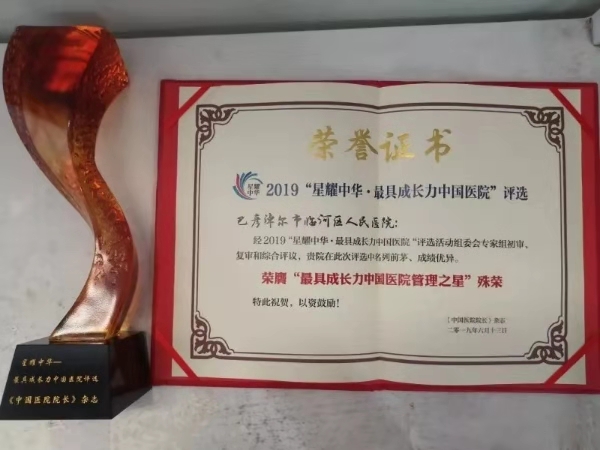 2019年7月5日,由中国医院院长杂志社主办的第七届中国市县医院论坛开幕式上,临河区人民医院荣获“星耀中华最具成长力医院评选—管理之星”奖。